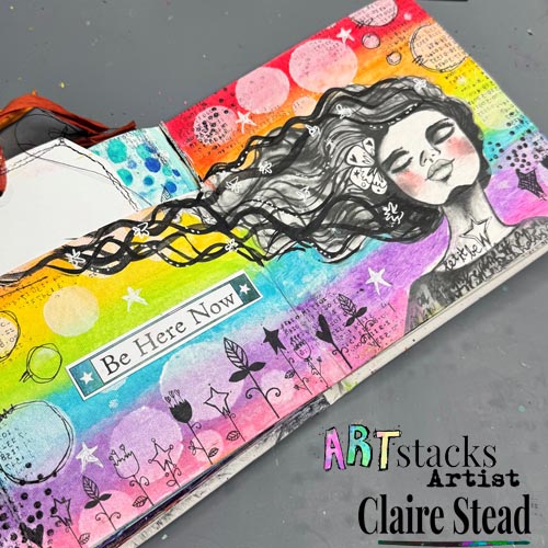“I used one of the tissue paper faces from the Fabulous Faces pack and adhered it using gel medium. Next I added some rainbow colours horizontally across the page and when they were dry I popped some white circle stencilling over the top. I extended the hair and made it flow out further, using a thin brush and acrylic paint. I adhered another piece of tissue with Tam’s flowers on it along the bottom the page from the same pack and added some white doodled flowers to the page too. I finished with some text and dot stamping and a quote from the Mystical Universe pack.”