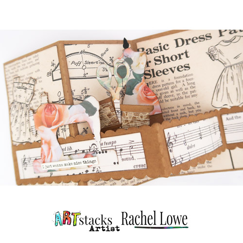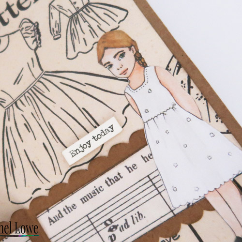 Rachel used kraft cardstock as her base and a cut file to cut her shapes. The stunning vintage papers on her background are from The Dressmaker pack, including the gorgeous vintage girl. Rachel decorated her sewing machine, scissors and dressmakers’ model with the beautiful roses paper from The Homemaker pack and finished with a quote from Shana Bebeklis’ Full Deck pack. She then added lace and twine to the cotton reels to add texture.