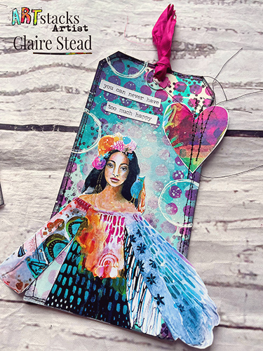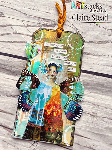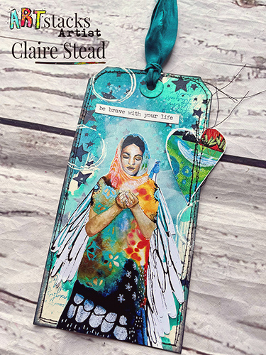 I started by adding watercolour wash to the background of my tags to give them beautiful, saturated colour.  Next I used a variety of stencils to co-ordinate (and contrast) with the background and most importantly, to showcase Tracy Verdugo’s beautiful angel figures. (From her Love Lives Here pack.) I also added a small area of white paint to create an area of calm for each angel to sit on. Next, I stitched around the border and also stitching a heart onto each tag.  Then I incorporated a white stamped circle onto each tag for some added interest. Finally, I placed quotes on each tag that I think fit well with the angelic theme.  I hope these tags are just the inspiration you are looking for today!