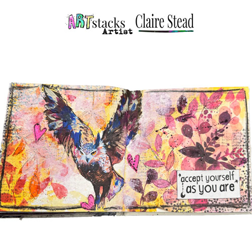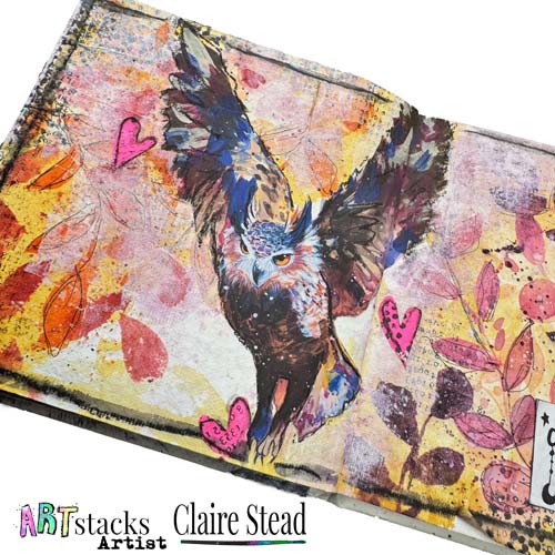 “I started with some of the leaves printed on translucent deli paper from the Wonderful World pack and adhered it to the page. I then colour matched some pigment powders and added them to the page, watering them down to match to the image. I painted on some leaves and added the owl from the Trick or Treat pack and extended the wings with paints.